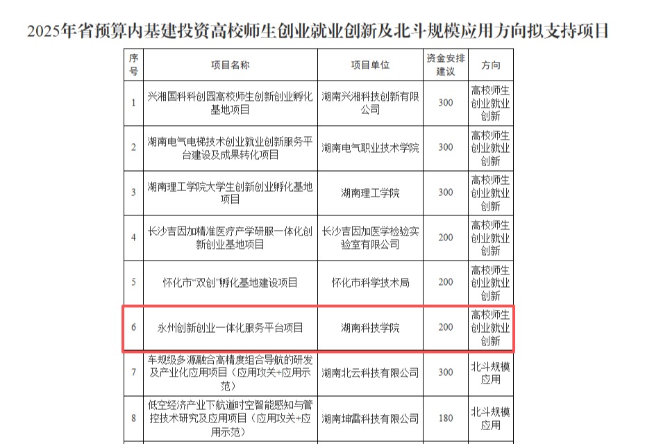 2025年,学校入选省支持大学生创业18所重点高校之一,“潇湘启航”大学生创业指导工作室被认定为2025年度湖南省大学生创业指导工作室,“永州创新创业一体化服务平台”获省发改委200万元专项支持。