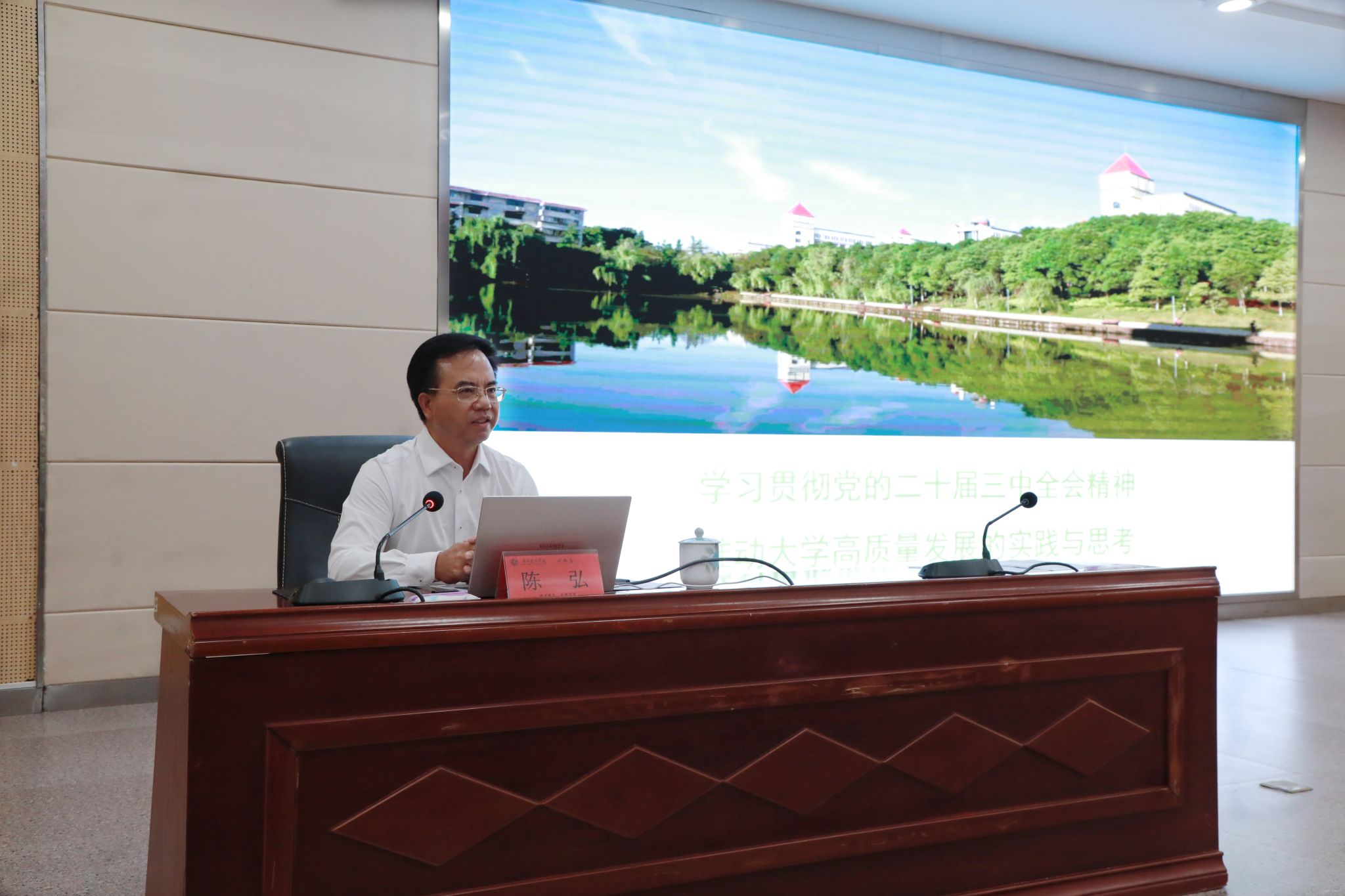 9月23日,学校举行学习贯彻党的二十届三中全会精神宣讲报告会暨党委理论学习中心组(扩大)第8次集体学习,湖南农业大学党委书记陈弘应邀来校作专题宣讲报告,全体在校党委委员、校领导,全体中层干部,机关副科级以上干部,全体辅导员,马克思主义学院教师以及学生代表共450余人参加会议,会议由校党委书记李钢主持。